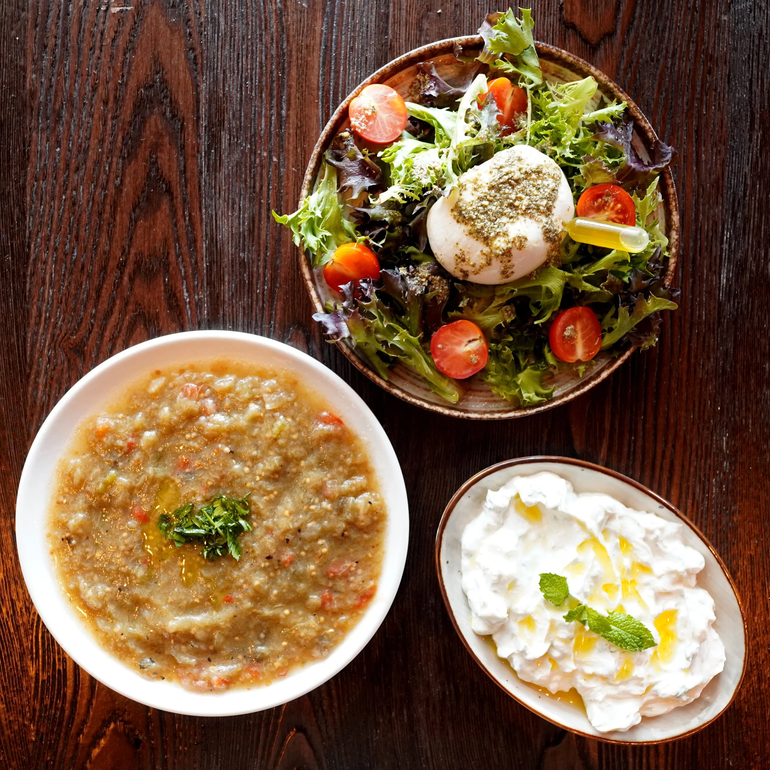 • Babaghanoush – Roasted eggplant purée with tahini and fresh herbs.